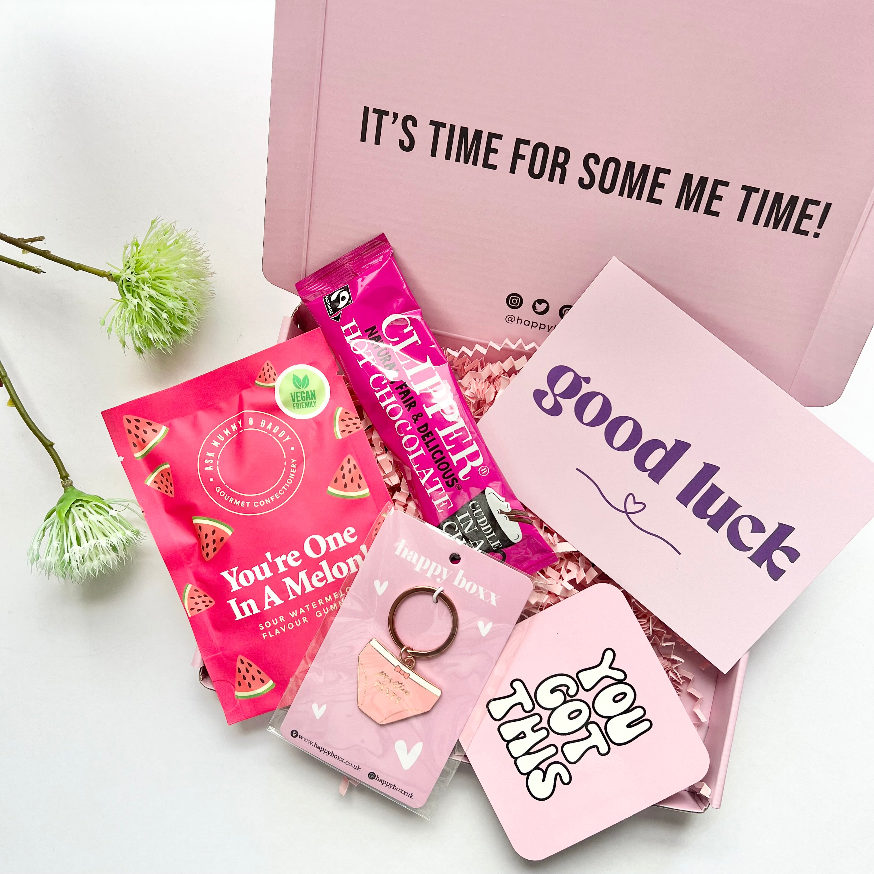 Inside they’ll find a cosy hot chocolate, Candy Kittens sweets, and uplifting keepsakes like a “You Got This” coaster and Positive Pants keyring — little reminders of resilience and belief. Complete the gift with your personalised handwritten message and a Good Luck card to make it extra meaningful.